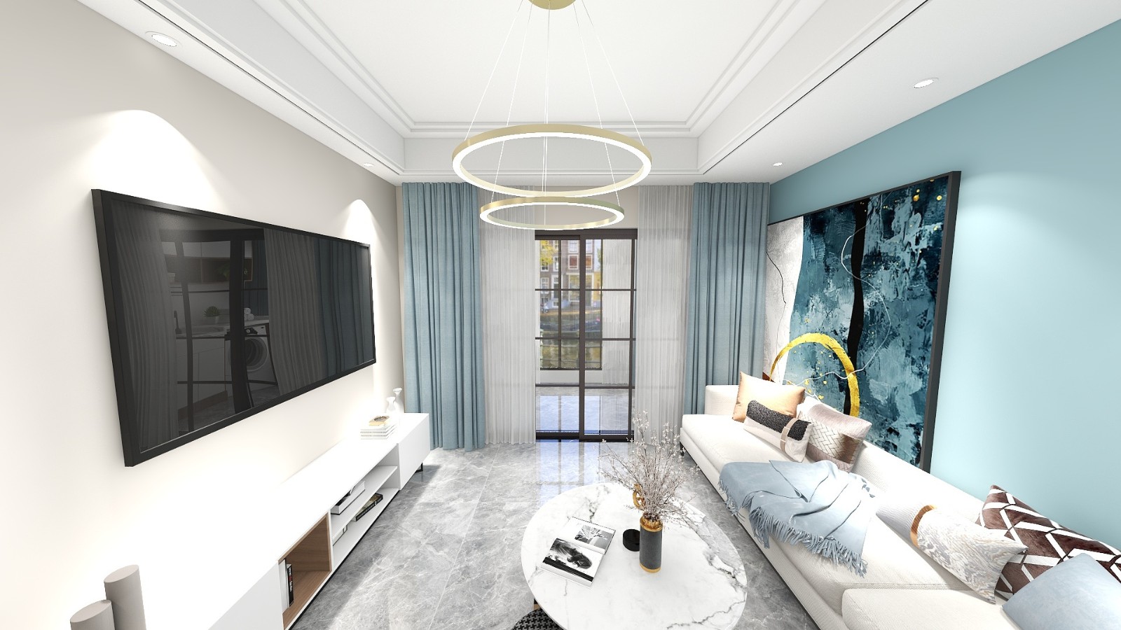 客厅两面墙拥有各自不同的色调,空间更加开阔通透。