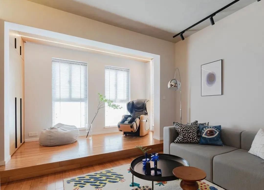 客厅最里面做抬高地台,形成采光明亮的方形地台活动区