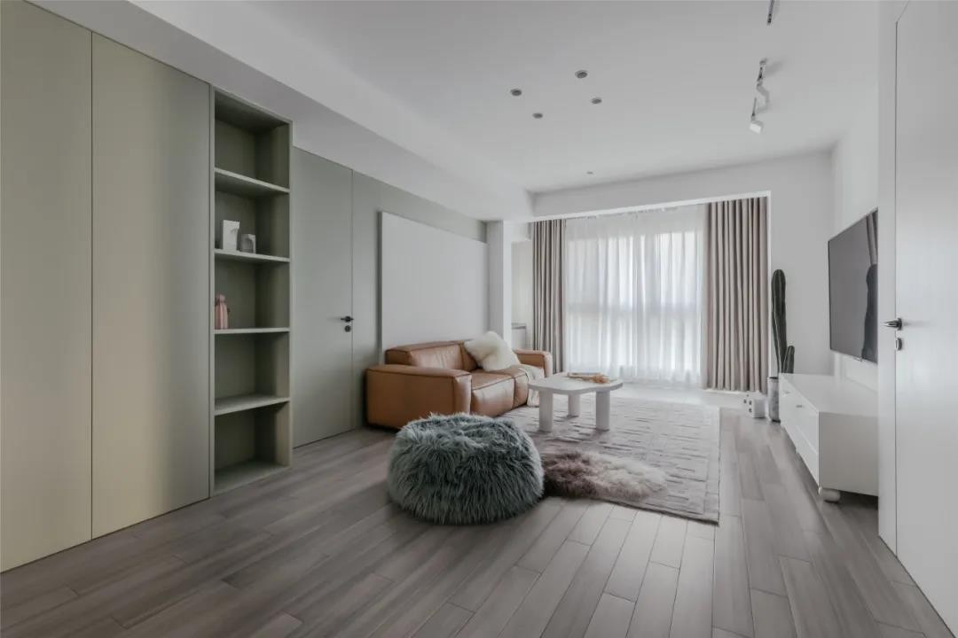 电视墙是个内凹的简洁空间,布置白色电视柜,旁边还有一盆仙人掌,侧边是摆设的木饰面+隐形门,整体充满简约文艺的清新感。