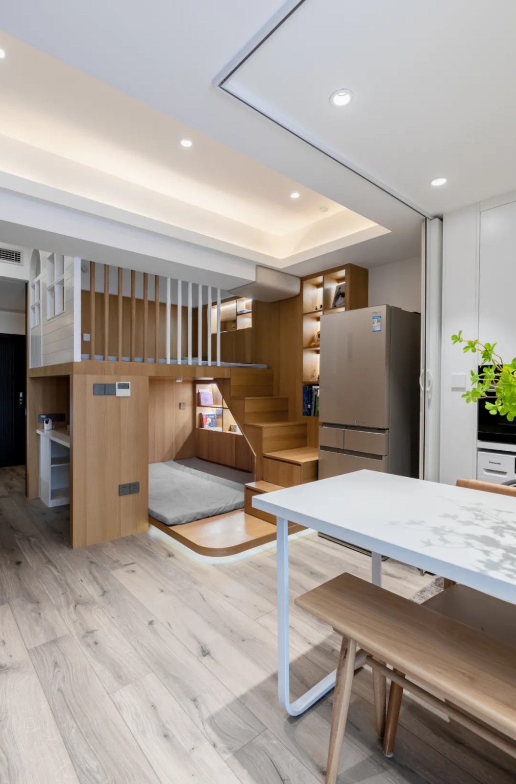 因为有柱子的影响,冰箱被设计在了收纳盒子和餐厨之间,过渡也算自然。