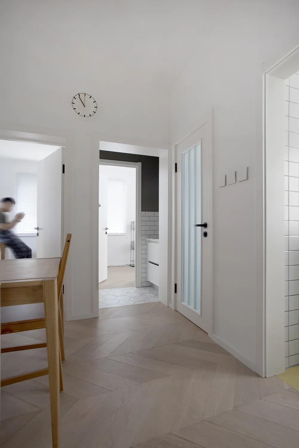 过道空间简约优雅的空间,墙面挂一个极简的时钟,提升空间的实用与情趣感;卫生间墙面是实木+玻璃门组合的组合,质感优雅又能增加采光,还有过道的工字砖等相呼应,显得更加文艺优雅。
