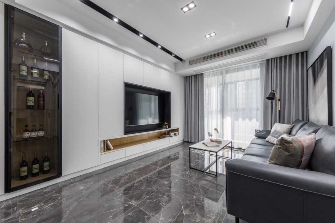 舒适的微风拂过纱帘,静靠于沙发上或放张躺椅,一览城市的灯火璀璨。简约的白色基调,本应平淡,但在酒柜的点缀下,空间颜值因此得到了升华。