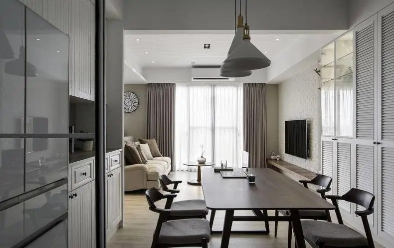 收纳上,则利用餐厅宽敞的走道上规划整排收纳柜,利用白色百也门片营造乡村气息,侧边局部挖空展示台面,用来摆放钥匙、信件等小物件。