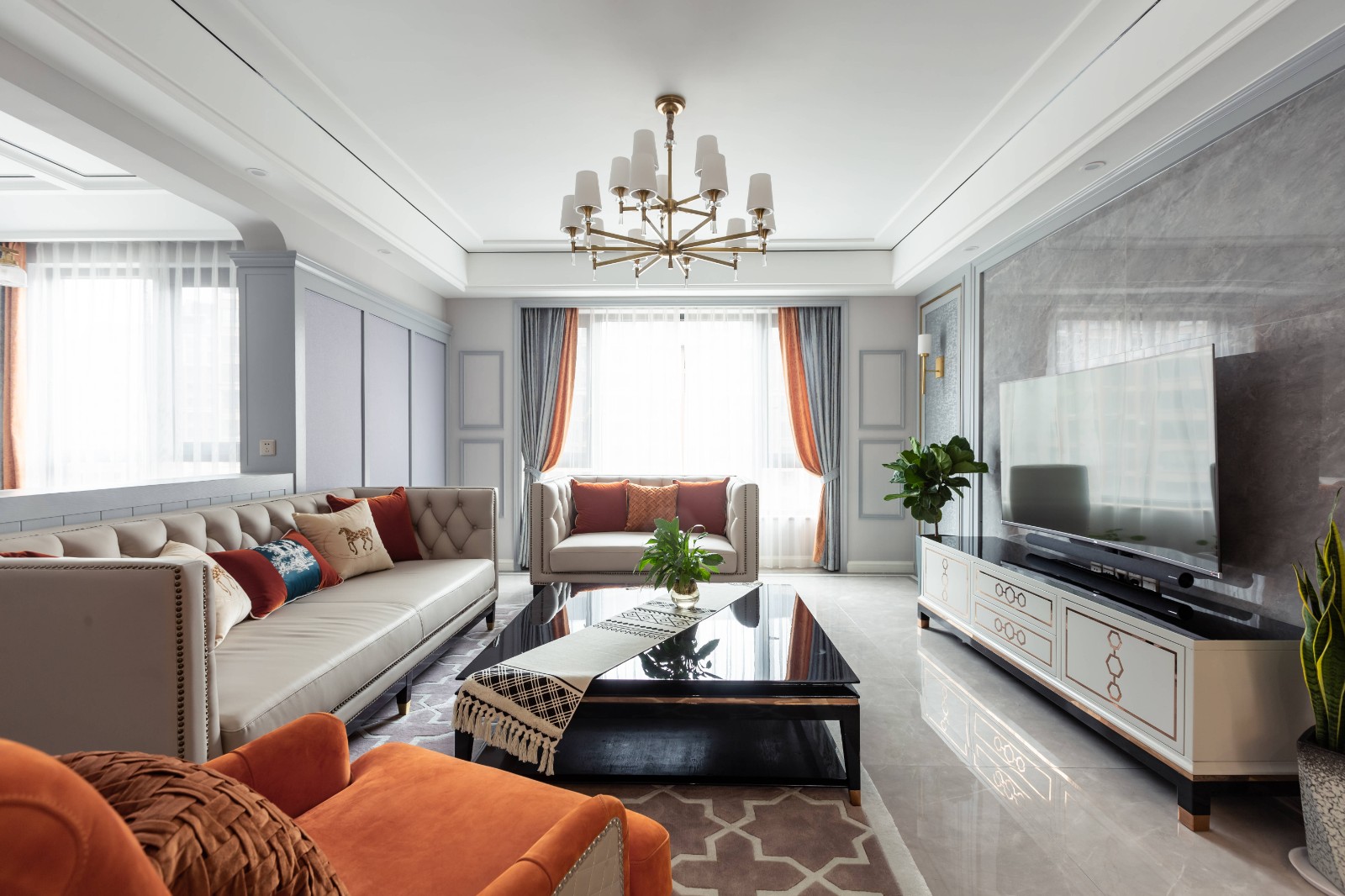 电视墙以定制柜作为主体,下方加入了几个白色的diy橱柜,摆上清新的绿植,让空间显得现代优雅而大气。