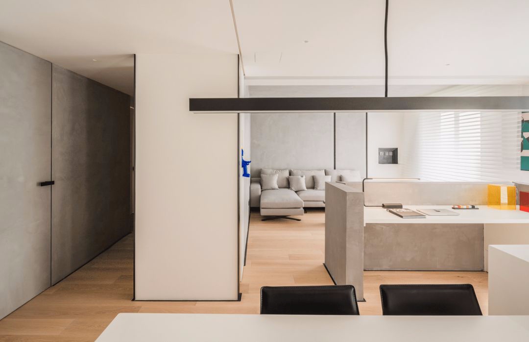 从天花到隔断,到整体细节 皆以利落线性勾勒出干净视野 灰白木高低错落,层次分明 透过材质与光影变化划分空间 创造出穿透度十足的流畅动线