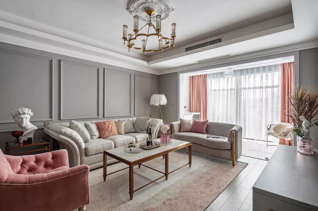 建筑面积128平米的美式轻奢风三居室案例,设计师以灰色作为主色调,搭配粉色的软装,在细节处加入了美式风的造型和铜质金属,让这个家看起来就非常有档次,本身也给人一种优雅、华丽的感觉,真是十分让人羡慕!