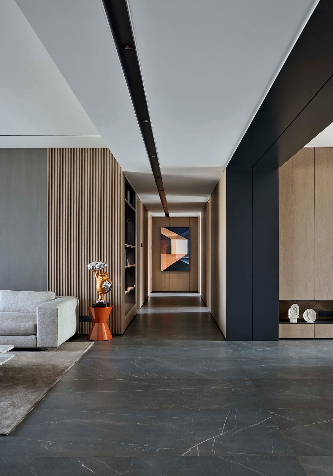 极简风格的空间 往往给人高冷的刻板印象 主人期待的家 干净有质感 但依然保留烟火气 生活的气息让他们享受待在家的感觉 设计师从细节入手 主基调采用大面积的灰色质感元素 同时加入大量的富有情感且温润的木质材料 给深灰色基调的空间升温、柔化 引入大自然的元素 让家更富有情感