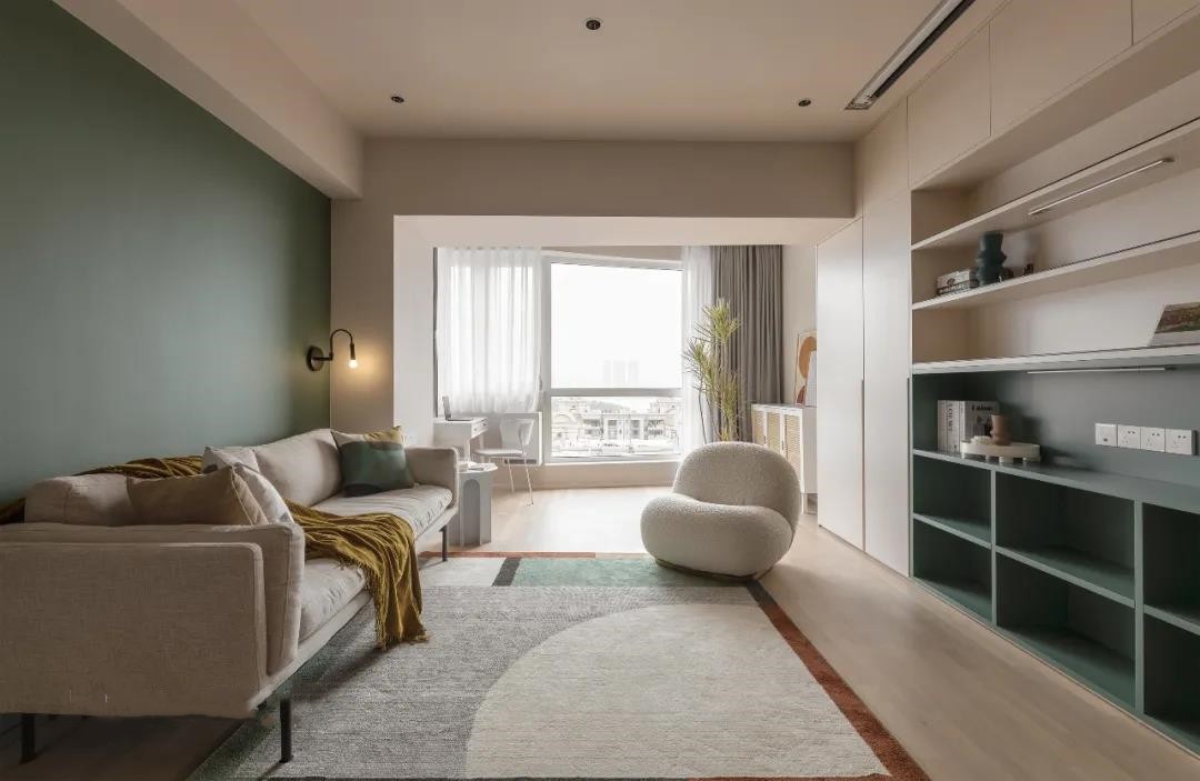 温暖而不单调的浅卡其与松石绿是家中的主旋律,客厅中无茶几设置+整面收纳柜让空间的使用自由不凌乱。