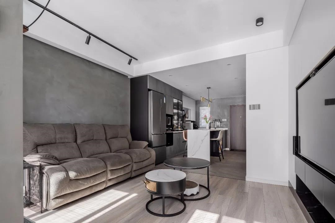 从阳台看客餐厨全景,整个空间以灰色为主调,简约大气,优雅质朴。客厅与餐厨区地面瓷砖形成区分,通铺木地板,光脚感受木材的温暖和包容。