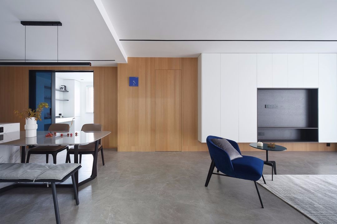 客厅整体空间以大面积留白为基础,配木色饰面做搭配,高饱和度的蓝色则用来串联整体空间。
