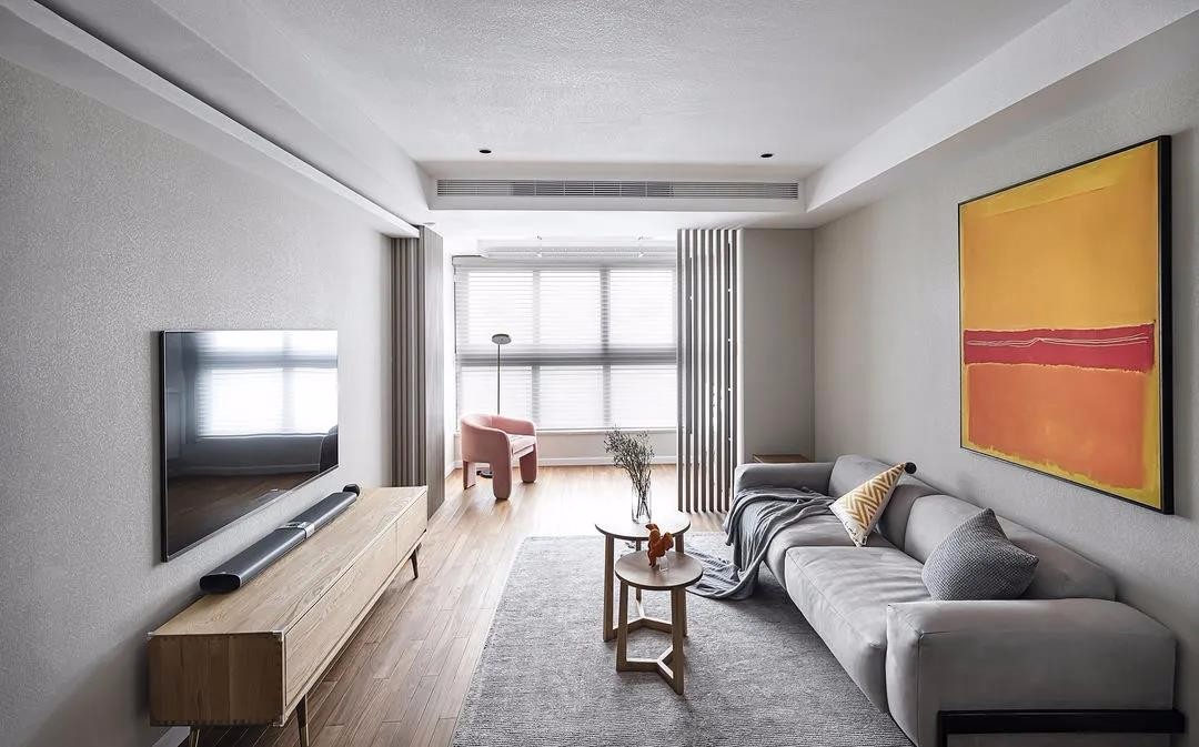 客厅回归简约,原木、灰与鉻黄色搭配,自然优雅、温馨而静谧。阳台纳入客厅,不仅扩大了活动空间,自然采光也变得更直接。局部吊顶配合无主灯设计,拉伸空间层次,让层高更为开阔。