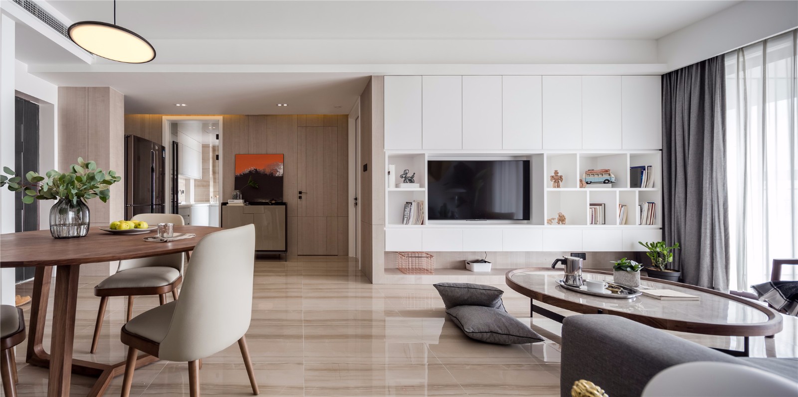 电视背景墙做的是大柜子,房屋需要增加通透性,采用白色显面积更加大,增加了收纳空间,