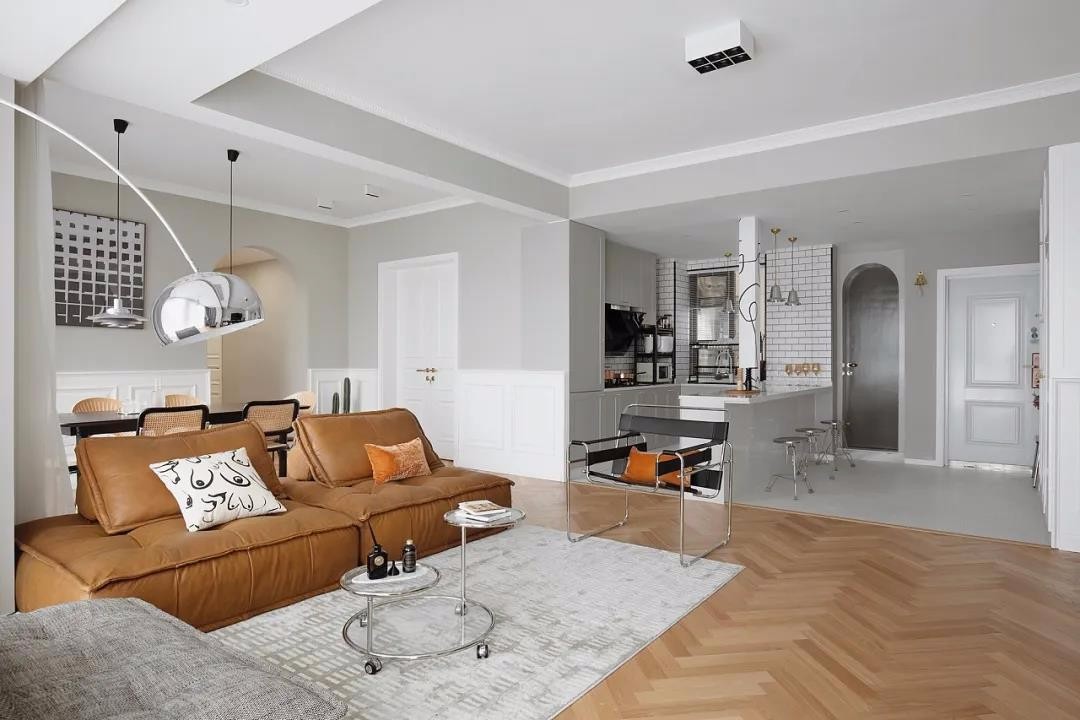公共区域把能敲的墙都敲了之后 获得一个大型开放式客餐厨一体的空间 玄关也开阔了很多 儿童房改了门洞位置获得了一排储物空间 对于大户型来说储物空间足够的情况下我们更多的是要思考空间的开阔度和流畅度。