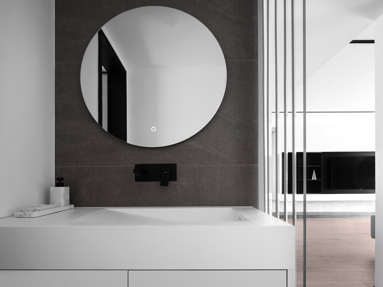 洗手间干湿分离,干区外放后选择拆除和走廊间的墙体,换用钢板打造带角度的倾斜百叶隔断,既遮挡浴室柜体保留视觉美感,也增添了空间通透感。