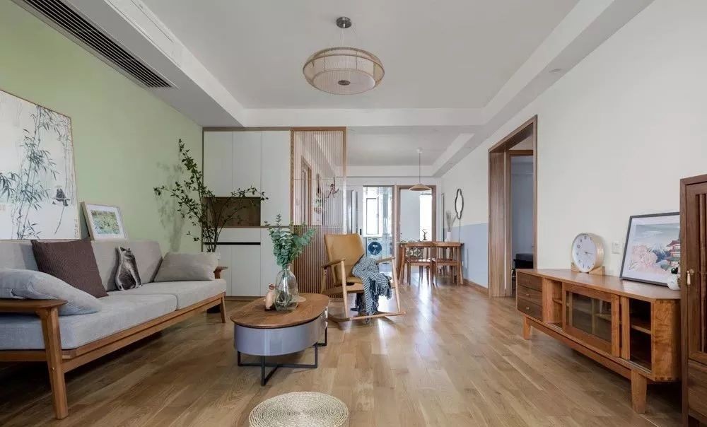 进入客厅,樱桃木色的中式风格家具搭配枫木色的地板,清新利落
