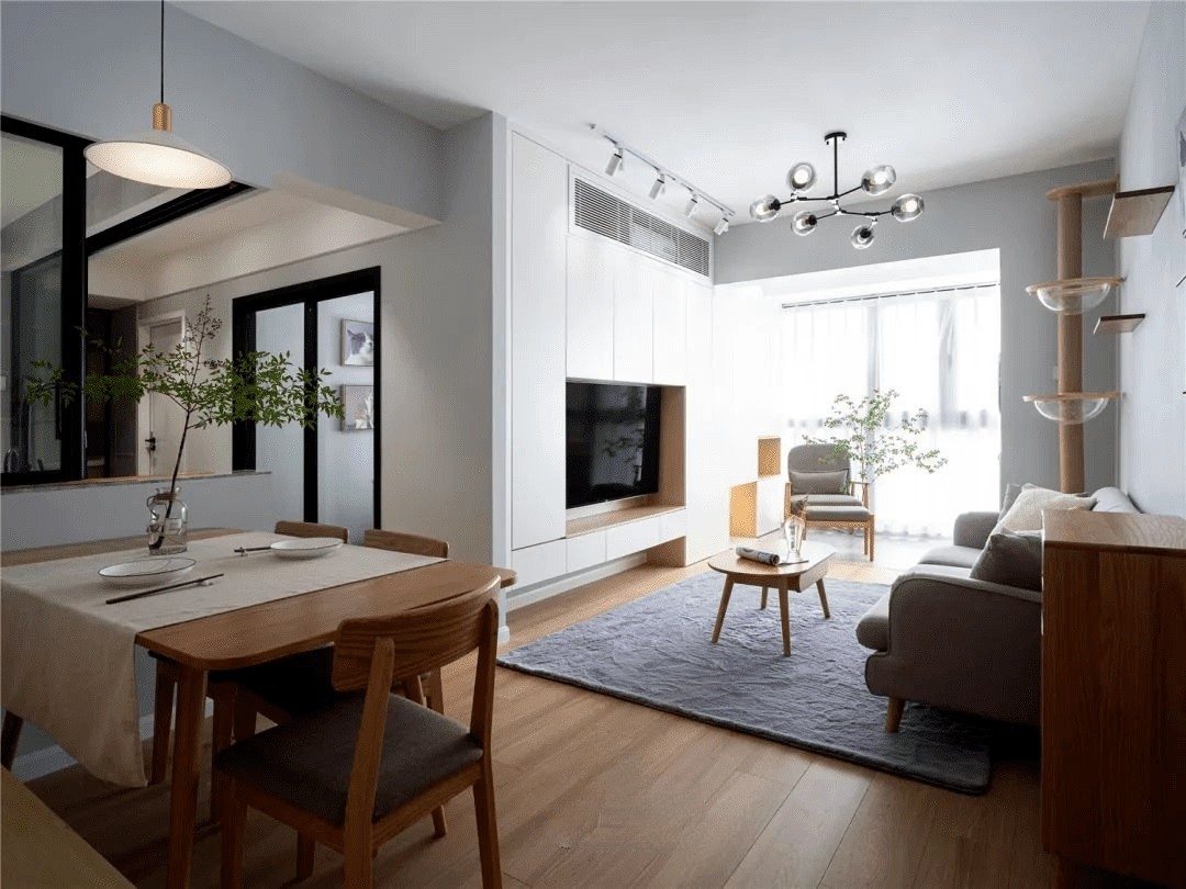 简约的原木色餐桌椅、卡座及墙上的开放式储物格,在花瓶中绿植的衬托下,营造出温馨舒适的就餐环境。