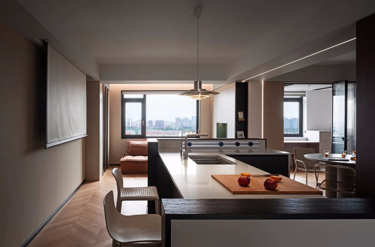 客厅舍弃了传统布局,定制了4m长的L型西厨岛台,用投影仪代替电视,赋予整个空间更多的可能性。打通了阳台,将沙发置于此,并在两侧定制了收纳柜,作为休闲空间。