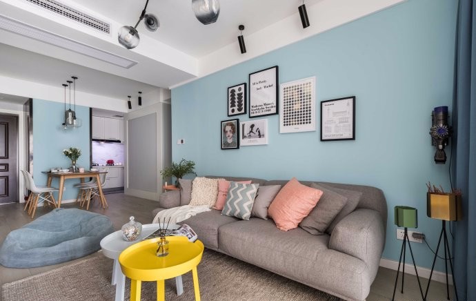 客厅选择灰色和蓝色做主体色,加上大小不一的挂画,满溢自然味道