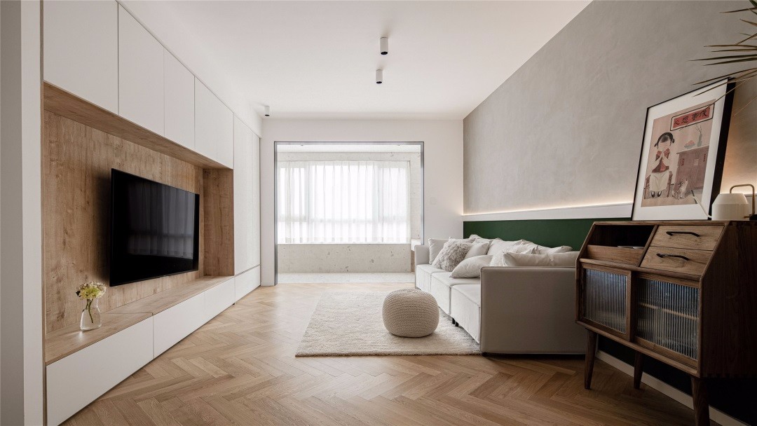 电视柜除了电视的留白,其他柜门全盖了起来,不会显得混乱,看着简洁大方,色彩上用了原木和白色做搭配.
