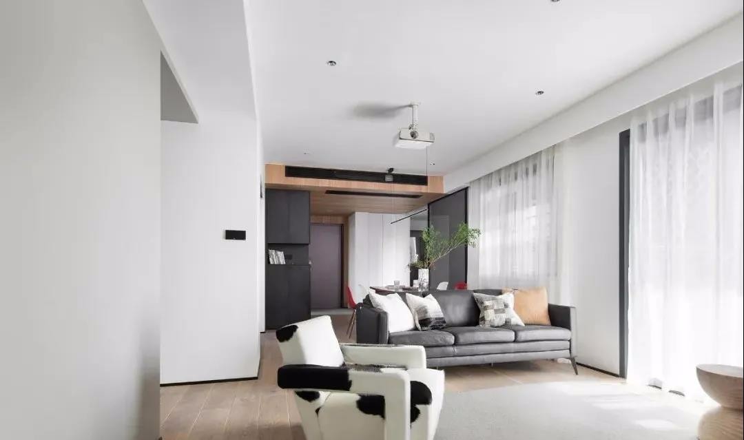 无主灯设计让空间的视线更加流畅,投影代替电视,幕布隐藏于整面收纳柜上方,红色窗帘成为空间中点睛的一笔。