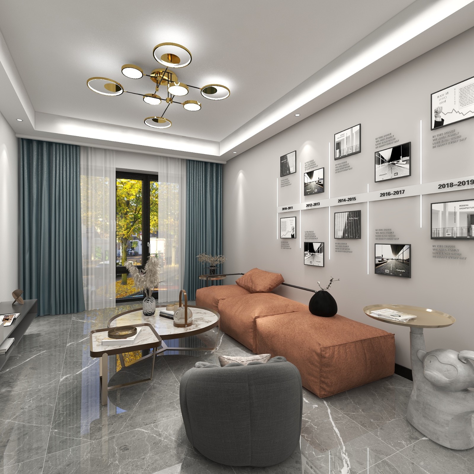 房子是一楼,入户即是客厅,沙发背景墙记录回忆照片