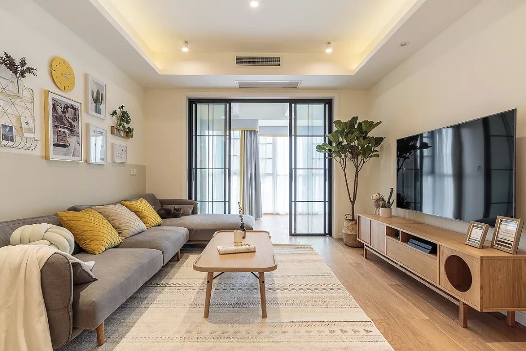 沙发墙是暖灰色墙脚 白色墙身的双色搭配,在上方墙身挂上一组简约的装饰画,搭配灰色布艺沙发与精致的软饰,整个空间充满了简约舒适的气息。