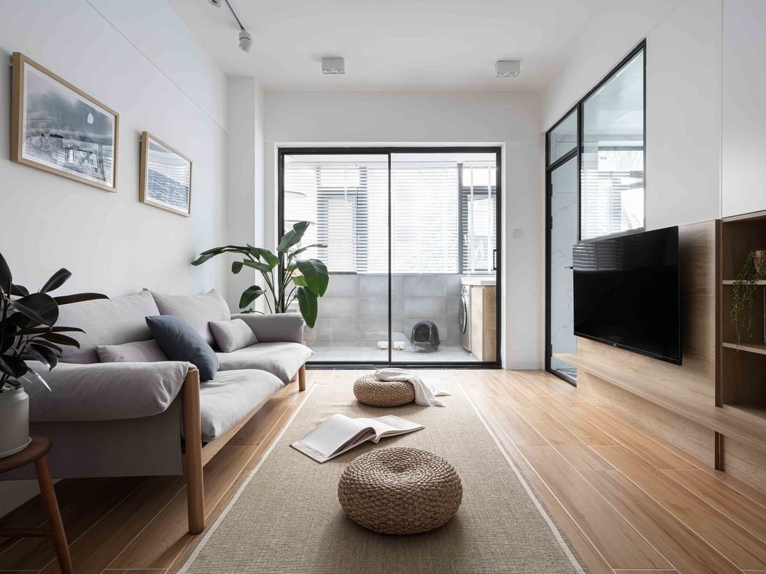 阳台封窗,将其纳入室内空间;但我们依旧在客厅与阳台之间加了窄框玻璃门,因为屋主想有效的管理两只猫大人平时的卫生与气味。