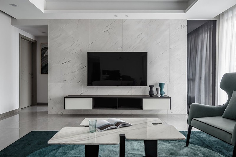 电视墙的设计,选用黑色镜面,中间选用白色大理石作为背景