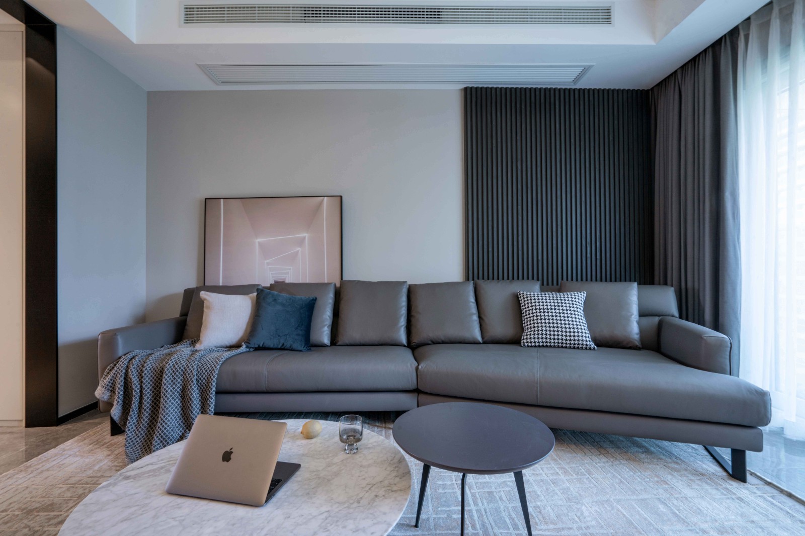 灰咖色的异形转角沙发细腻了硬朗的格调,