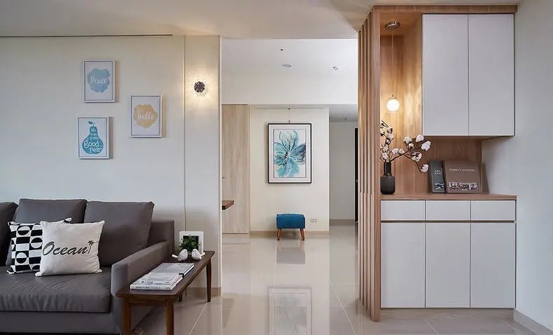 玄关定制了一个柜子,作为入门的端景视觉,除了加强实用机能外,还解决了业主重视的风水问题。玄关鞋柜依照风水老师建议,特地采上下柜设计,满足鞋子只能摆放下层的分区需求。