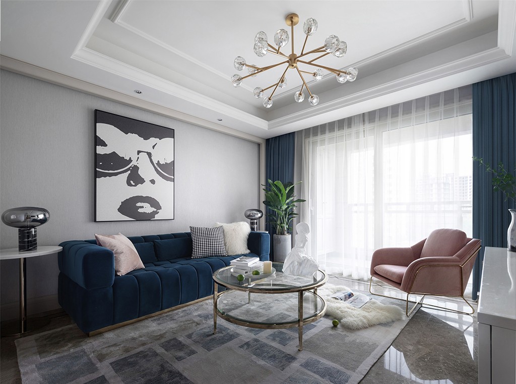 客厅颜色主要以灰蓝色为主,两侧的粉色沙发给客厅增加一点暖色,