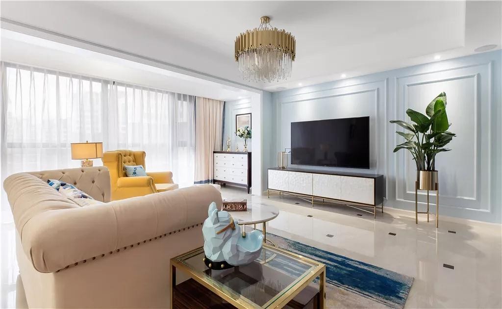 客厅电视墙在淡蓝色的空间基调做了边框造型,搭配上轻奢范的家具细节,呈现出一个淡泊优雅的视觉感。