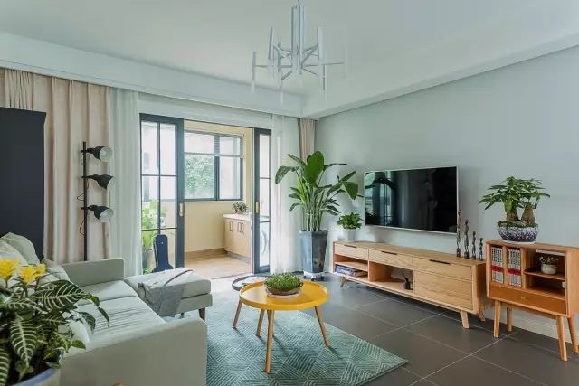 108平简约风格温馨新房装修,整体格调走的都是那种非常简单小清新的文艺风格,入户玄关由于正对餐厅,所以这里做了一个隔断墙,反而让餐厅区域更有独立空间感。整个客餐厅地面也选择了更现代简约风格的灰色地砖。客厅阳台之间用黑框玻璃推拉门隔开,阳台的主要功能是比较日常接地气的洗衣晾晒区,充满了生活的情调。餐厅另外一边布置了一个休闲区,钢琴和卡座沙发,在百叶窗和绿植的衬托下,特别真实美好。