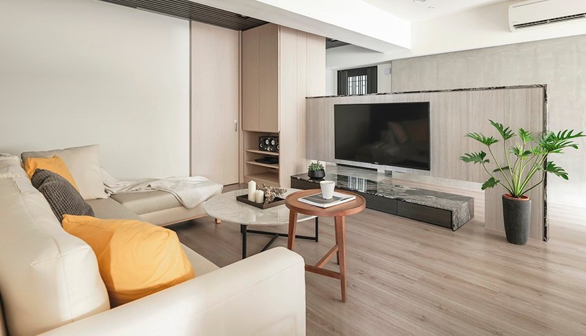 屋主重视家人相处层面,讨论时就强调简单明亮的开放式空间,也因为孩童处于成长年纪,需要自由玩耍空间,随性大方的北欧风,适合有幼童家庭,以清新面貌凝聚一家四口的窝。考量到预算,电视墙使用仿石材美耐板,边缘加上大理石点缀,而在客厅家具方面,沙发和茶几都是屋主自行挑选,简约米色与住宅气氛不谋而合,搭配跳色抱枕与植栽,空气中多了活泼生机。