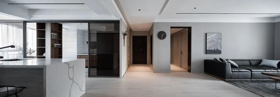 ▲沙发墙在灰色的背景墙基础,侧边挂一幅高山画面的装饰画,旁边还有一个过道,过道门洞另一侧则是挂了一个圆形时钟,在黑色沙发的布置下,整体空间显得现代端庄而稳重高档。