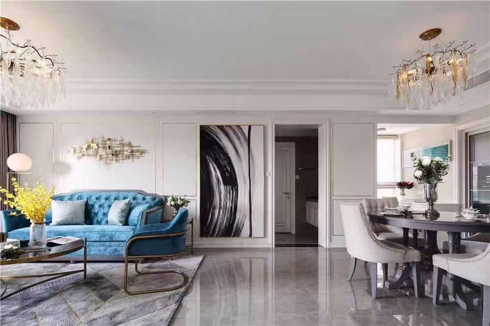 客厅颜色主要以白灰为主,搭配蓝色沙发提亮空间