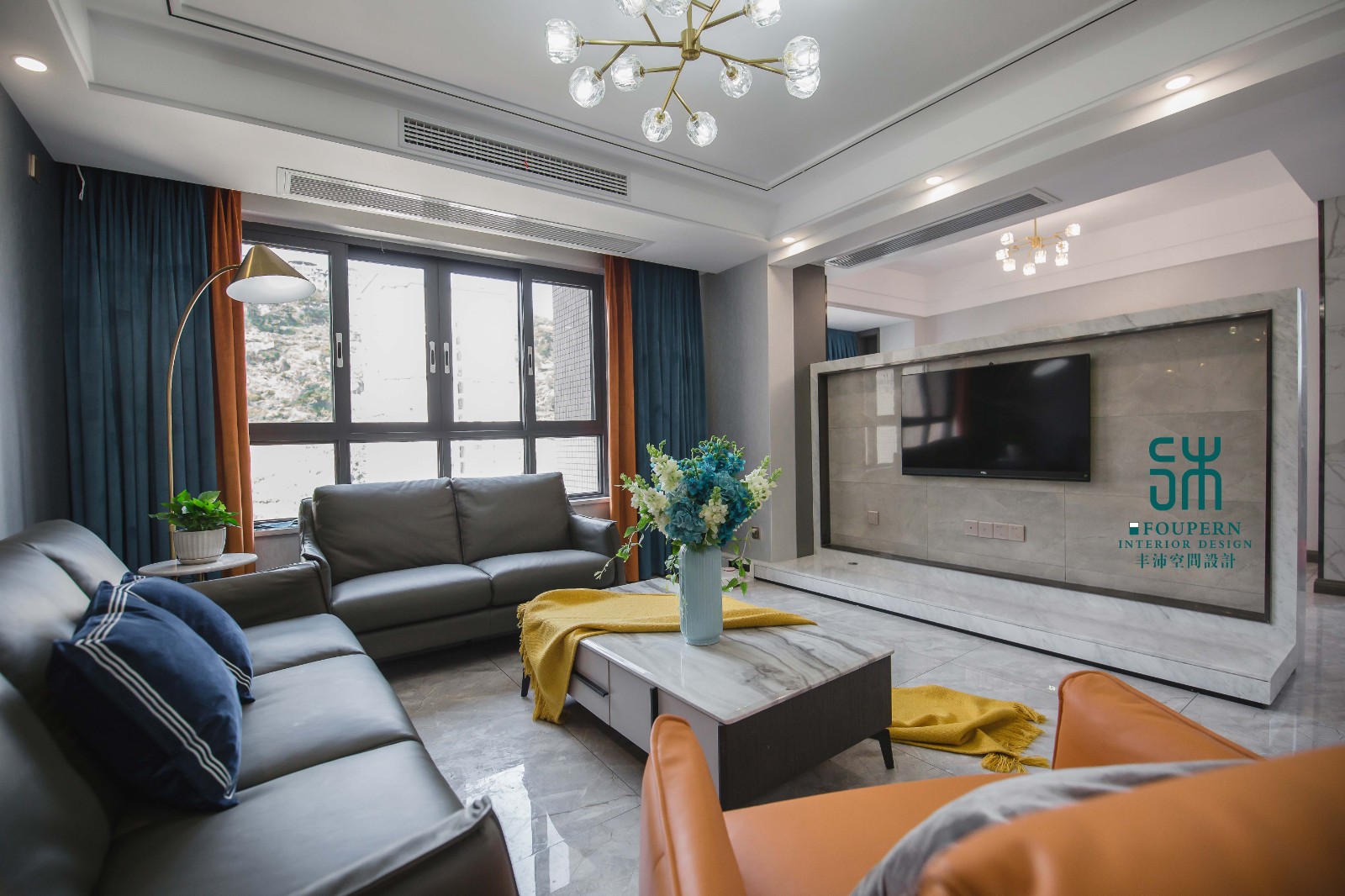 总体深灰色的电视背景墙和深灰色的木地板,则能显现出大床的简约轻奢主义感。