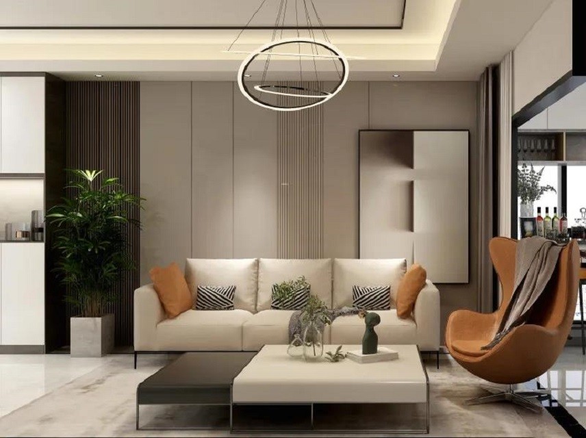 为区分功能布局,规划师采用线条感十足的定制板和黑胡桃木格栅,打造干练、纯粹的沙发背景墙。再搭配简洁线条感的皮质沙发及茶几,烘托现代都市风。 直线条过多不免死板,曲线造型的蛋椅和弧形吊灯给冷硬的空间增添一丝轻盈、柔和。