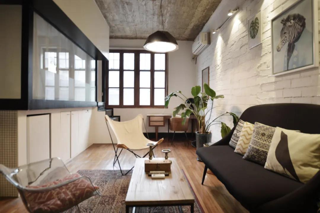 ▲整个大厅的天花分为两部分,一部分是水泥底的毛坯质感,另一部分是防腐木的吊顶,结合沙发墙上的文化砖背景墙,整个空间充满小资优雅的工业风气质。