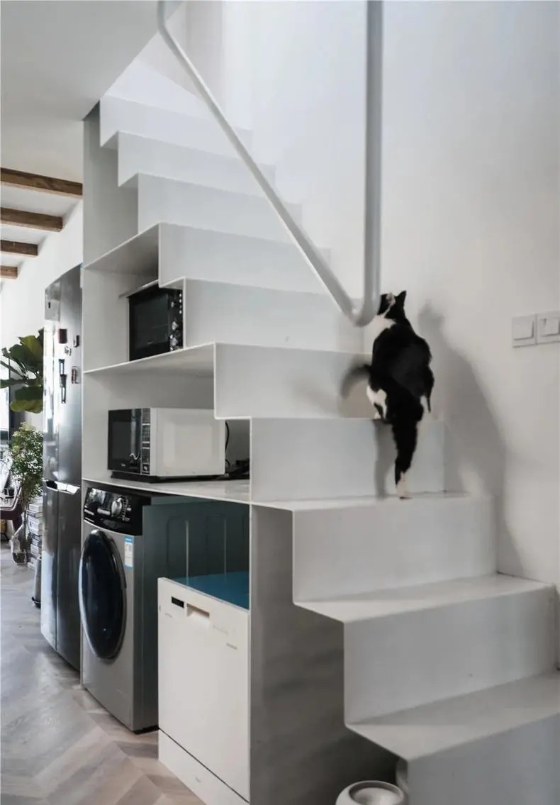 楼梯位置紧邻厨餐厅,同样也是设计的很合理,将楼梯下方的空间充分利用起来,下方各种橱柜收纳,家电内嵌,节省空间的同时,也将洗衣机放在这里,合理安排有效而高效。