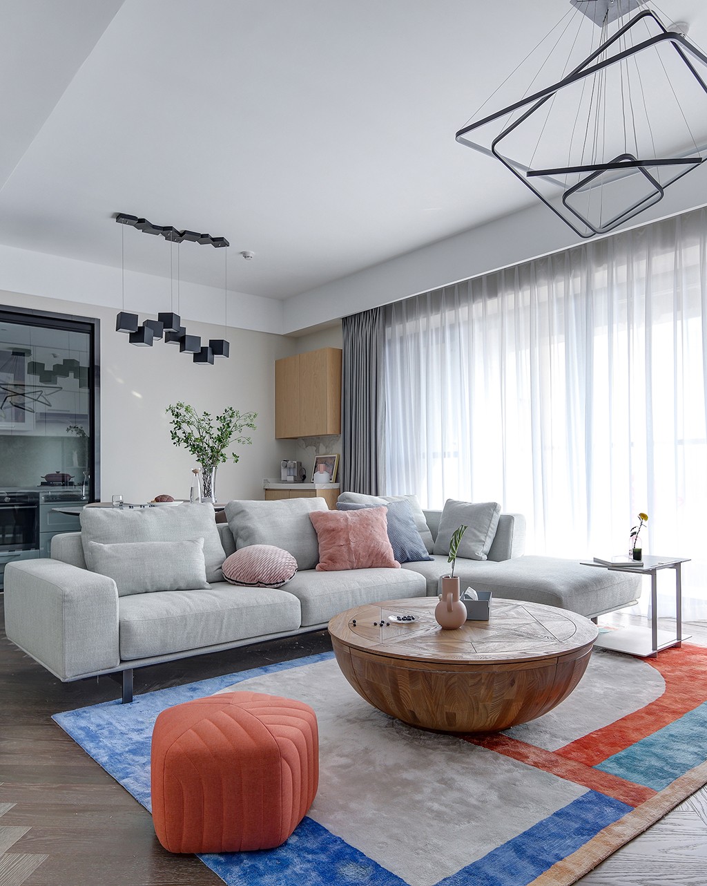 客厅的设计简约中透露了一点可爱,白色纱帘的设计让客厅的光线变的更柔和,灰色的转角布艺沙发,让客厅更舒适,搭配粉色的抱枕和蓝色的抱枕给简约的空间增添几分灵动,地毯选用灰+橙的组合几何,充满活泼,让客厅更温馨、时尚。