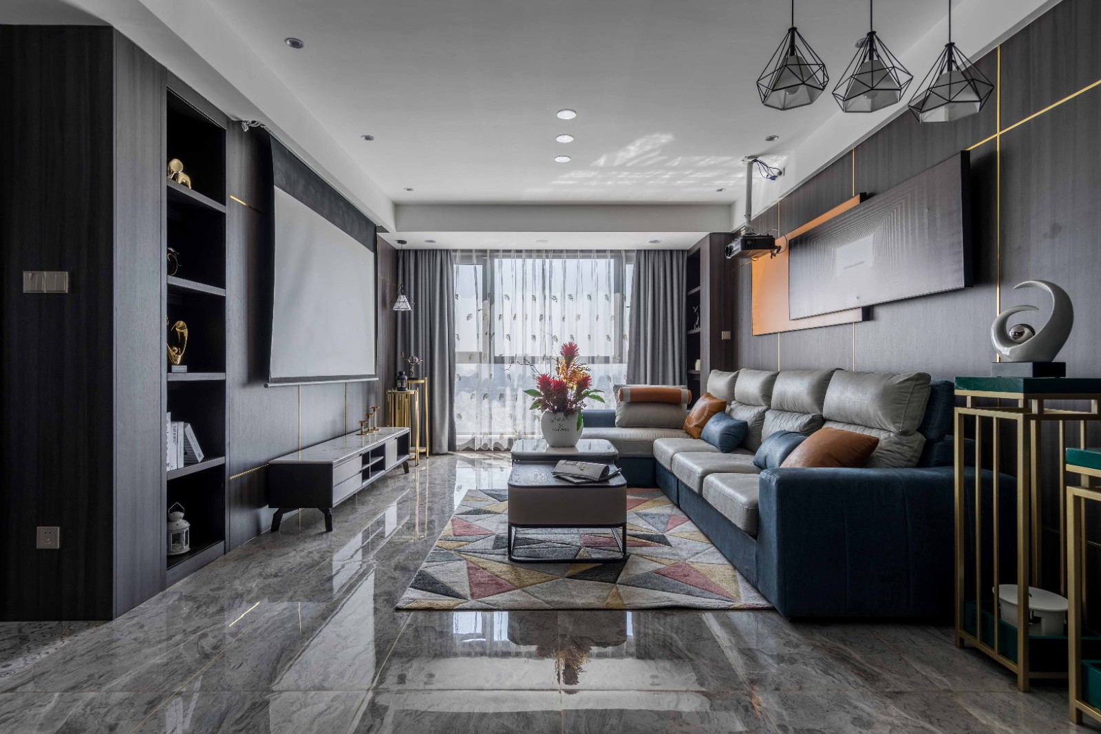 客厅一切以简约纯粹为主,抛开传统电视机的摆设,取而代之的是投影幕,