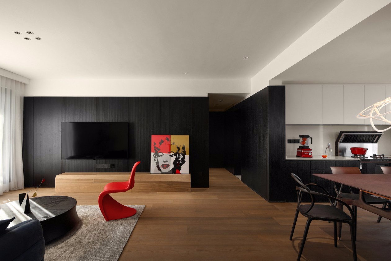 空间在黑白基础上,加以潘通浓烈的红为点缀,以玛丽莲梦露和单椅带出居室的艺术美学造诣。