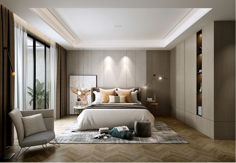卧室以米色调搭配简洁的线条,搭配出一个高冷又不失气质的卧室。