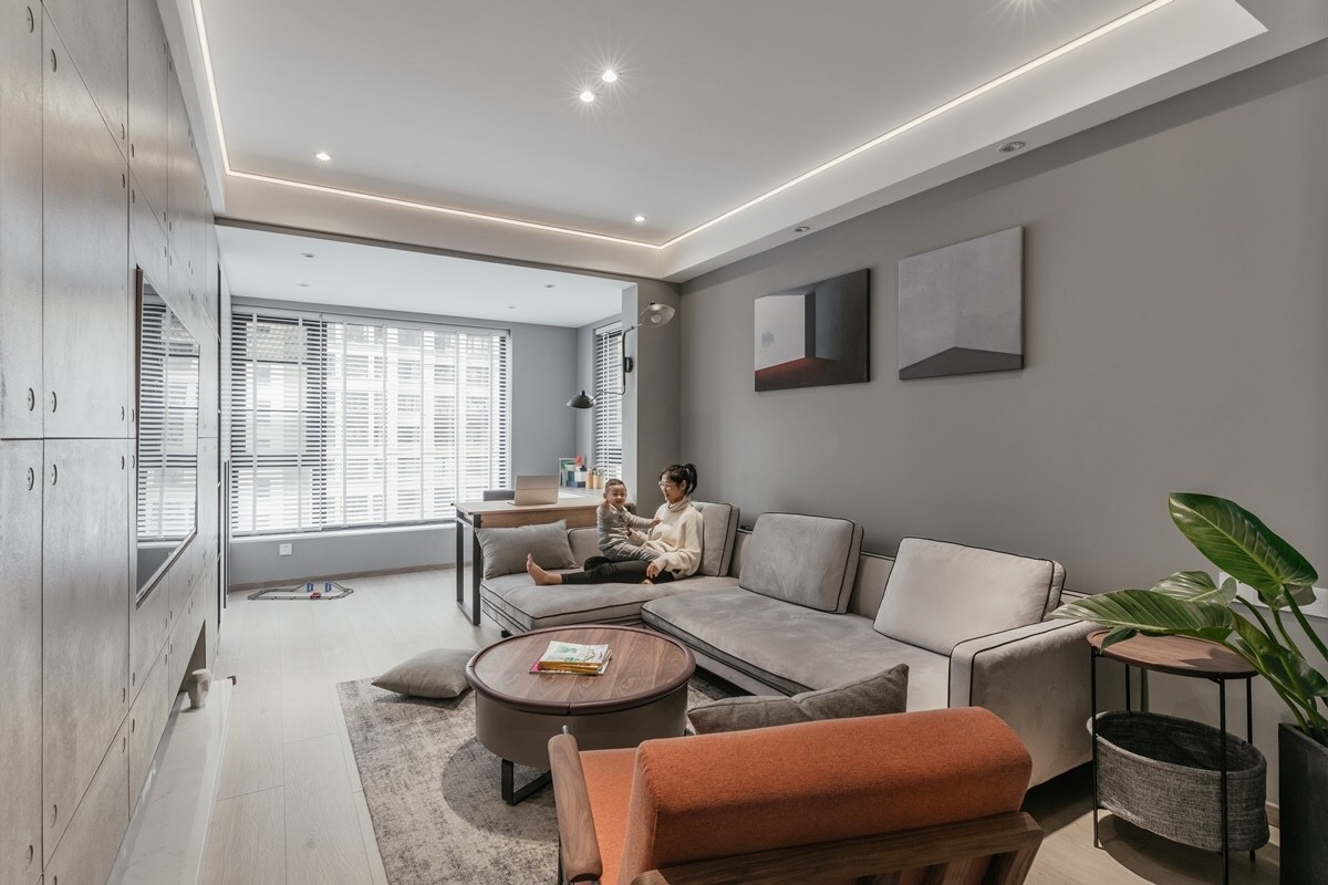 本案业主是一对夫妻和一个小朋友。夫妻俩在空间风格上有着共同的想法,对水泥质感的装饰情有独钟。为了方便交流,设计师将客厅和厨房、餐厅打通结合成一个区域,在各自做着不同的事情同时,可以感受到相互的陪伴,随时分享心情、阳光和食物。