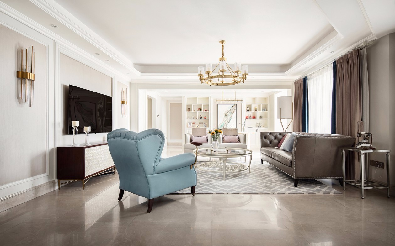 业主对新家的期待出发,基于美式风格的硬装基础,充分利用室内空间,通过软装的尺寸、颜色、材质等要素,将温馨、浪漫的氛围融入典雅大气的空间中,更显室内温暖干净、富有生活气息又不失格调 客厅