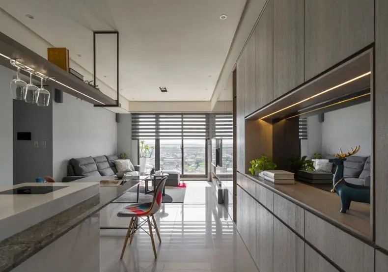 家居公域呈长条状分布,规划整洁,有序。 设计师考虑到耐看,避免选择了过于流行的设计元素,整体用色、用聊以简约为主,这样的做法是比较靠谱保险的。 要知道,当下特别流行的东西过5年可能就觉得不适合出现在家里了,还是经典的、简约的更实在。