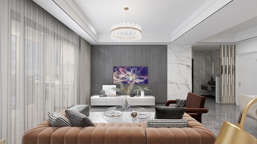 洗手台位置没有做半墙分割而是采用屏风隔断加柜体的方式与客厅分割,这样既增加采光、增加收纳空间又显得美观。