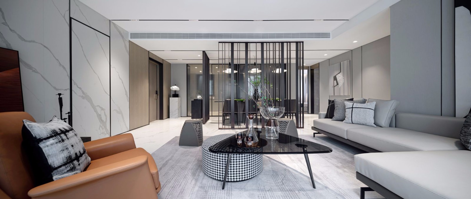 延续建筑外立面“超纤细(bezel-less)”的质感元素,为空间中的每根线、每个面进行合理地绘制和呈现,或错落,或穿插,而不同材质的纹理和色彩相互融合且对比,增强了空间画面的层次感。