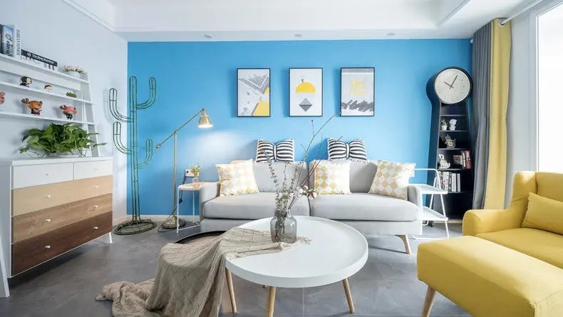 虽然客厅大面积的用了素色,蓝色、白色、黄色、灰色,但是每个颜色都尽显清爽,即便是素色搭配起来也依然时尚有活力。 简约可爱的沙发组群,让业主一家可以围座在一起,看看电视,聊聊天,陪伴女儿玩耍、讲故事,温馨十足。
